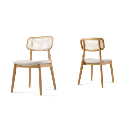 Cadeira contemporânea com linhas finas, encosto em tela e assento estofado. Pés em madeira maciça
